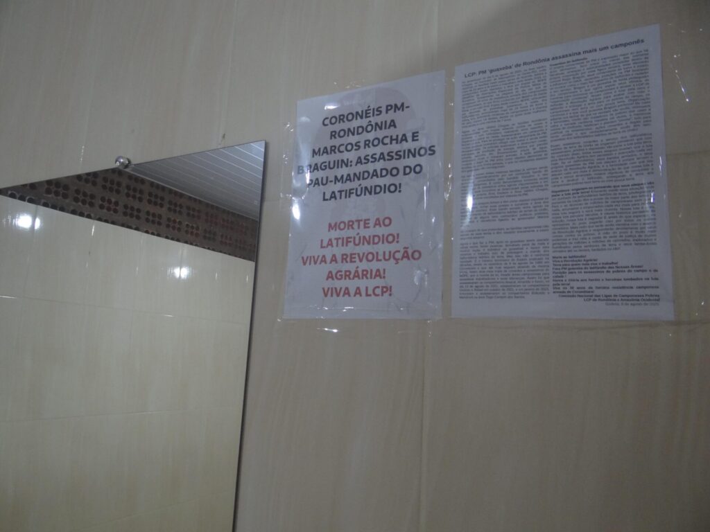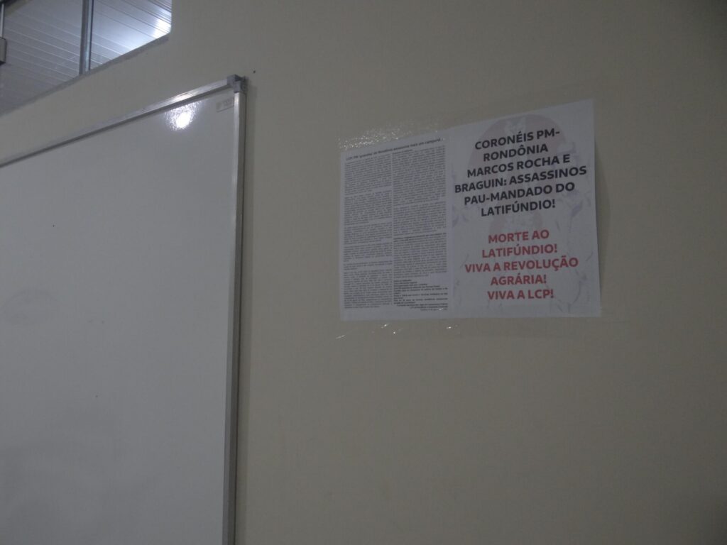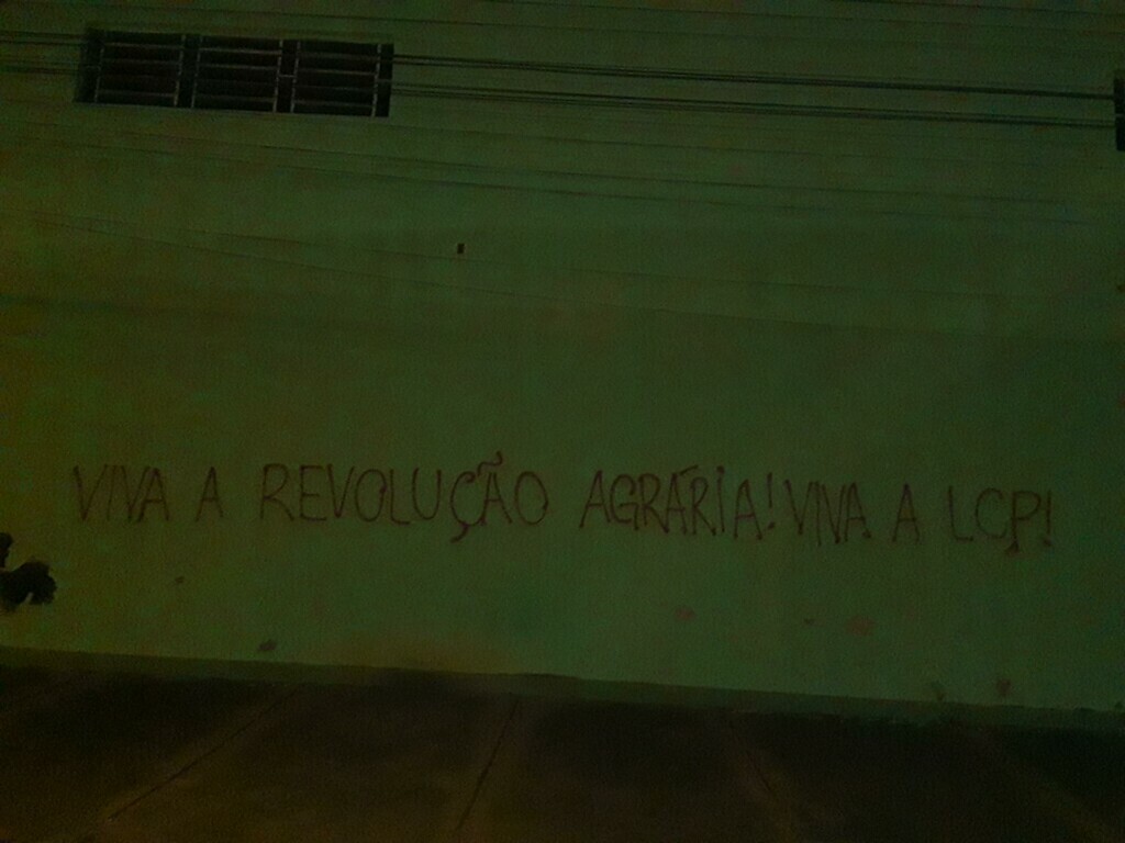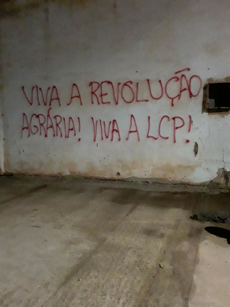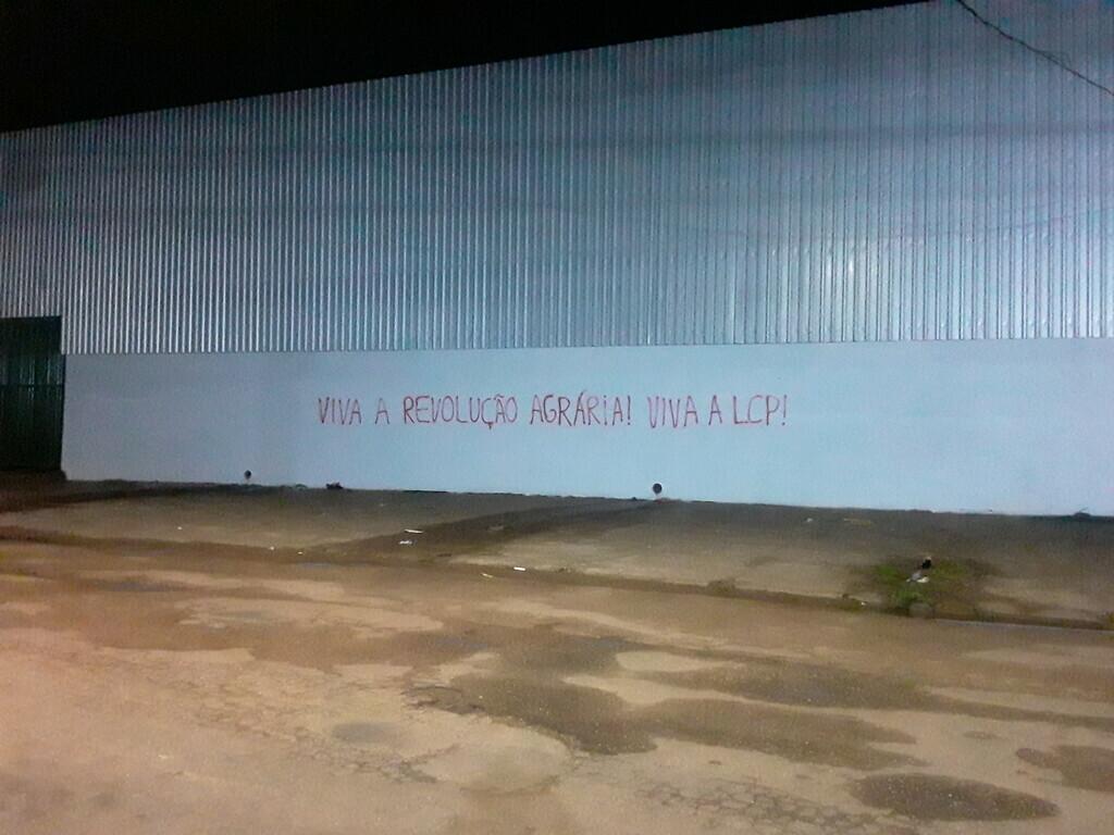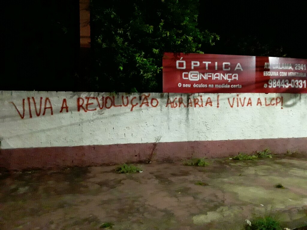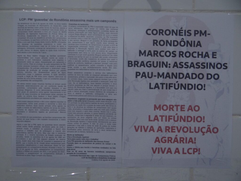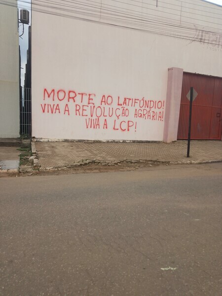 Recebemos nos últimos dias registros de várias regiões do País, de diversas ações de propaganda revolucionária em apoio à Liga dos Camponeses Pobres – LCP e à Revolução Agrária em curso no Brasil, bem como em condenação à Polícia Militar de Rondônia e seu comandante Cel. Régis Braguin e os cães do latifúndio Gesulino Travagine Castro e a cumplicidade do governador Marcos Rocha.